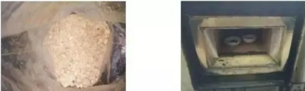 調(diào)研過(guò)多家醫(yī)藥化工企業(yè)RTO爐,發(fā)現(xiàn)大部分企業(yè)RTO爐在運(yùn)行一段時(shí)間后,蓄熱床層底部有二次污染物大量積聚(如圖2)、黏附現(xiàn)象,易造成蓄熱床層底部堵塞,引發(fā)火災(zāi)等安全事故。以某醫(yī)藥企業(yè)為例,經(jīng)過(guò)取樣試驗(yàn)分析發(fā)現(xiàn),該二次污染物具有以下特性: